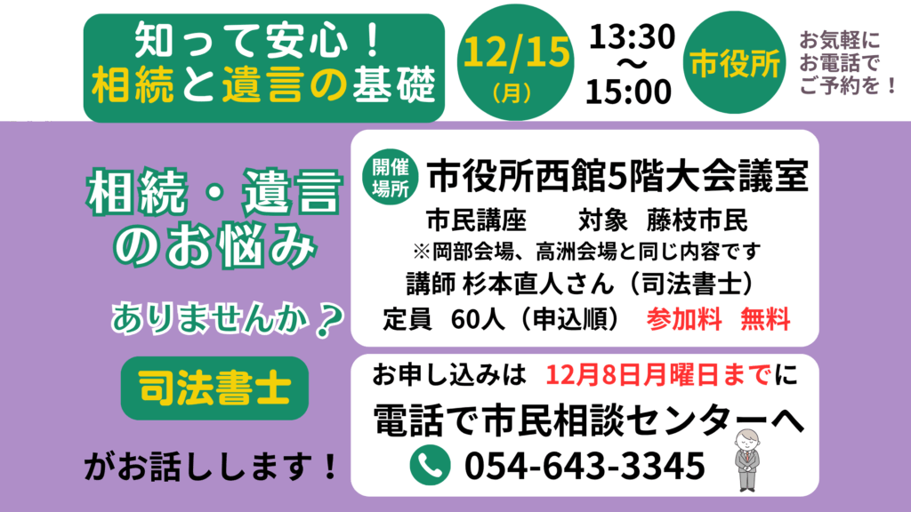 | 内容 | 相続と遺言に関する基礎知識について(岡部会場、高洲会場ともに同じ内容です。) ◆講師 杉本直人さん(司法書士) |
